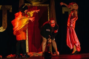 “Vampire Lesbians of Sodom” by Charles Busch, at Jobsite Theatre in Tampa, Fla. through Nov. 23; pictured: Summer Bohnenkamp, Spencer Meyers and Zachary Hones (photo by Crawford Long)
