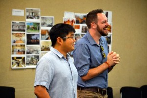 Playwright Mike Lew and Director Moritz von Stuelpnagel on the first day of rehearsals for “Tiger Style!” at the Alliance Theatre. (Photo by Kathleen Covington)