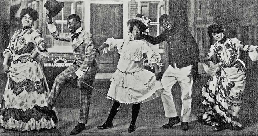 Hattie McIntosh, Geo W. Walker, Ada Overton Walker, Bert A. Williams, and Lottie Williams in the 1903 Broadway production of “In Dahomey.” (Photofest)