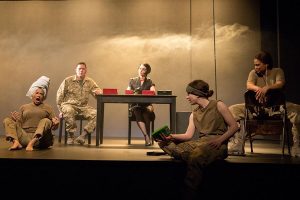 Yvette Ganier, Keith J. Conallen, Sarah Gliko, Hannah Gold, and Melanye Finister in “Don Juan Comes Home From Iraq” at the Wilma Theater in Philadelphia in 2014. (Photo by Alexander Iziliaev)