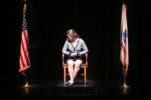 Grace Rattigan (Jessiee Datino) testifies in “Other Than Honorable” at Geva Theatre Center. (Photo by Huth Photography)