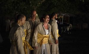 The five Shylocks in “The Merchant of Venice” in the Venice Ghetto in 2016: Ned Eisenberg, Andrea Brugnera, Adriano Iurissevich, Jenni Lea-Jones, and Sorab Wadia. (Photo by Andrea Messana)