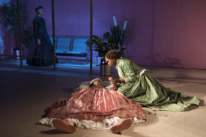 From left, Karen Kandel, Ismenia Mendes, and Quincy Tyler Bernstine in “Marys Seacole” at LCT3. (Photo by Julieta Cervantes)