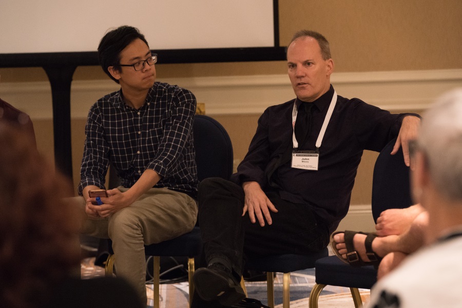 Wei-Huan Chen, critic for the Houston Chronicle, and John Moore, of DCPA News Center, at a session on new models for arts jouranlism at the TCG Conference in Miami. (Photo by Jenny Graham for TCG)