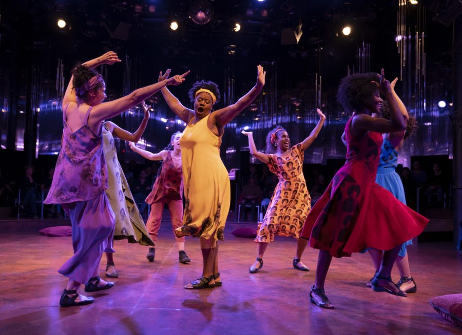Adrienne C. Moore, center, as the Lady in Yellow in ‘for colored girls…’ at the Public Theater. (Photo by Joan Marcus)