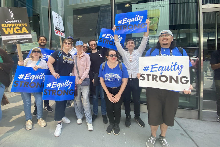 Members and staff of Actors’ Equity Association join a WGA picket line on May 10. (Photo by Amelia Merrill.)