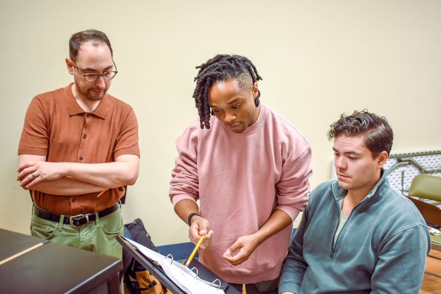 “King of Harlem” writers David Gomez and John-Michael Lyles talk with actor Gabriel Bernal at a rehearsal.