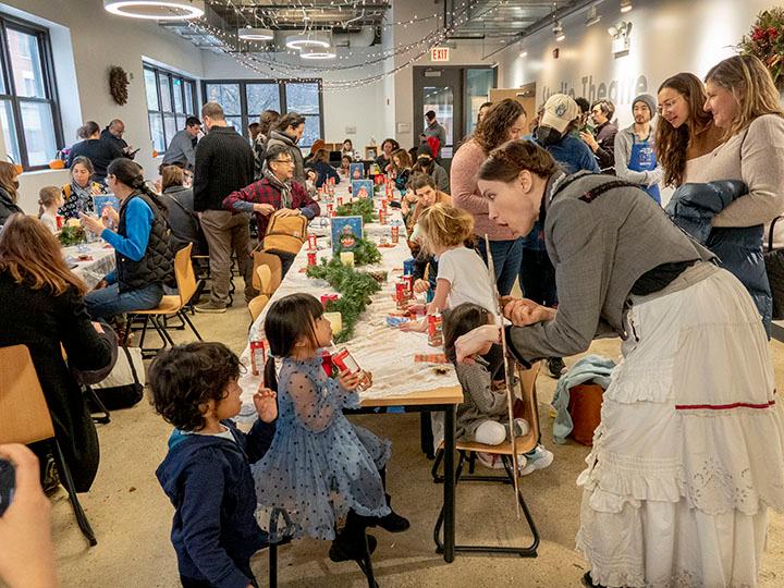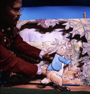 The result? A puppet show with boxes that expand, contract, and fold out to reveal exciting plot elements and scenery. Two performers manipulate toy theatre-style puppet characters brimming with personality, and a one-man-band akin to Dick Van Dyke provides sound and song to each story. Every year, the team switches up which stories will be told from the Beatrix Potter collection, but every year they end with a favorite: Peter Rabbit. Will Bishop cited audiences’ delight in recognizing characters they love, laughter as they make mistakes (like the kittens letting their good tea party clothes get dirty and torn), and audible commentary on the world of each animal tale.