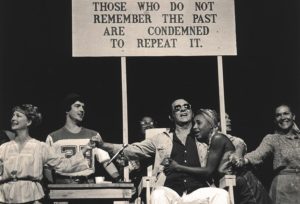 Richard Kneeland and members of the Trinity Repertory Company in “Jonestown Express” in May 1984. Production designed by Eugene Lee, costumes by William Lane. (Photo by John C. Meyers)